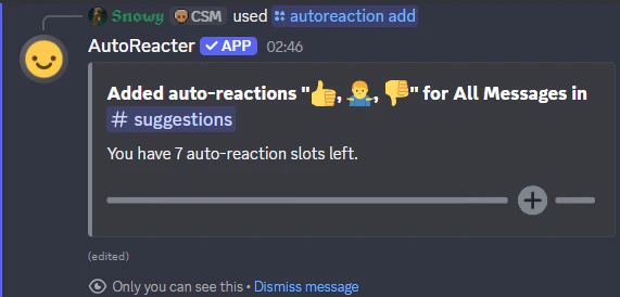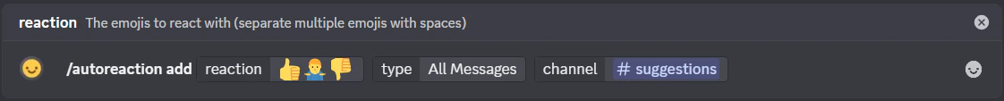 Add an auto-reaction to a channel. The bot will automatically react with your chosen emoji(s) to matching messages.Permissions