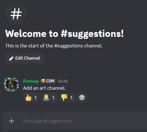 Multiple emojis reacting to all messages in #suggestions: